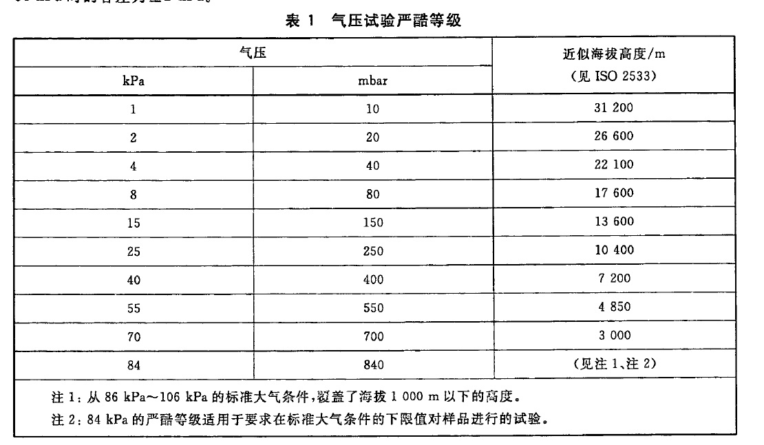 上圖是GB/T2423.21-2008中規(guī)定的氣壓試驗等級。地球大氣受重力作用,離地面越高,空氣越稀薄,氣壓也就越低。在標準大氣條件下,海平面氣壓約為 101.3kPa 。隨著海拔上升,氣壓呈非線性下降趨勢。這是因為大氣并非均勻分布,越往高空,空氣分子數(shù)量越少,分子撞擊物體表面產(chǎn)生的壓力也就越小。