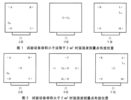一,根據(jù)試驗(yàn)設(shè)備容積的大小,將工作空間分為上、中、下三層,中層通過工作空間幾何中心點(diǎn),將一定數(shù)量的相對濕度傳感器布放在其中規(guī)定的位置上,傳感器不應(yīng)受冷熱源的直接輻射。