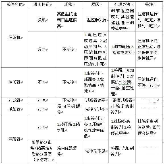 眾所周知,溫度是表示物體的冷熱程度的物理量,是制冷工程的一個重要的技術參數。高低溫試驗箱的主要部件是:壓縮機、冷凝器、過濾器、毛細管、蒸發(fā)器等,也就是說,他們的工作溫度特征反映了整個制冷系統(tǒng)的運行狀況。我們在判斷高低溫試驗箱是否存在故障時,最行之有效的方法就是用手去摸各部件的表面溫度。然而,他們的溫度特征怎樣才算正常,請看下表。